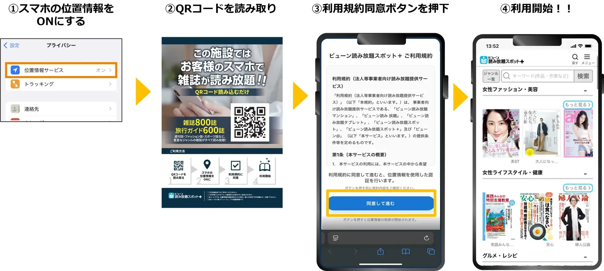 新サービス『ビューン読み放題スポット+』とは、導入施設ごとに発行される専用QRコードを読み取るだけで利用を開始できる読み放題サービスです。